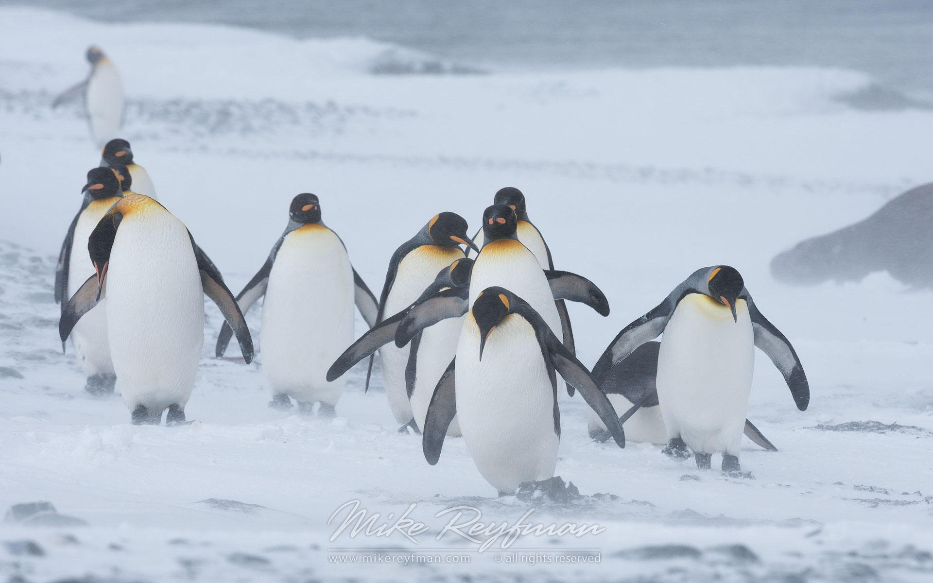 Snow Kings. King Penguins (Aptenodytes patagonicus) fighting with elements. Salisbury Plain, South Georgia, Sub-Antarctic