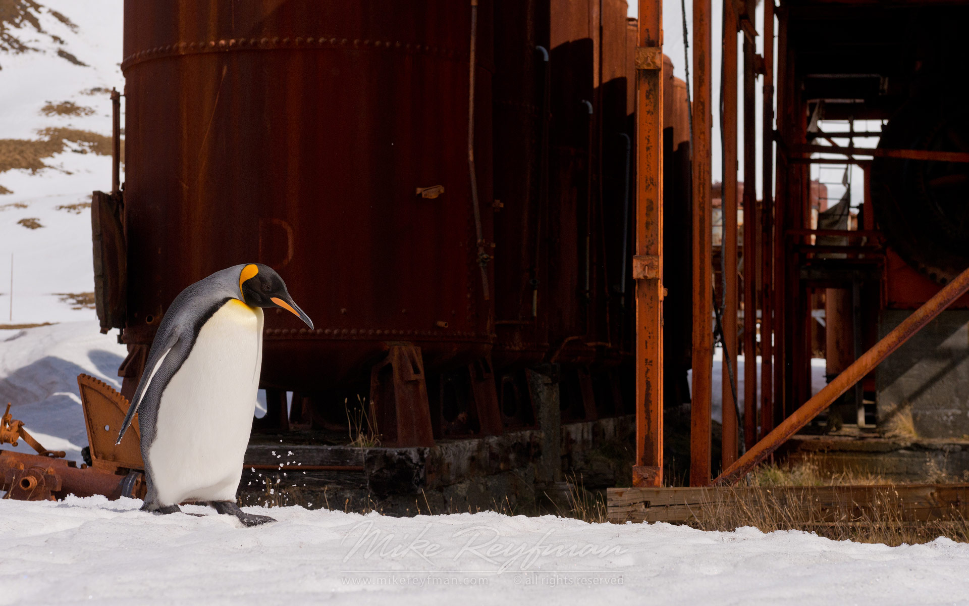 King Penguin (Aptenodytes patagonicus) exploring abandoned Grytviken Whaling Station. South Georgia, Sub-Antarctic
